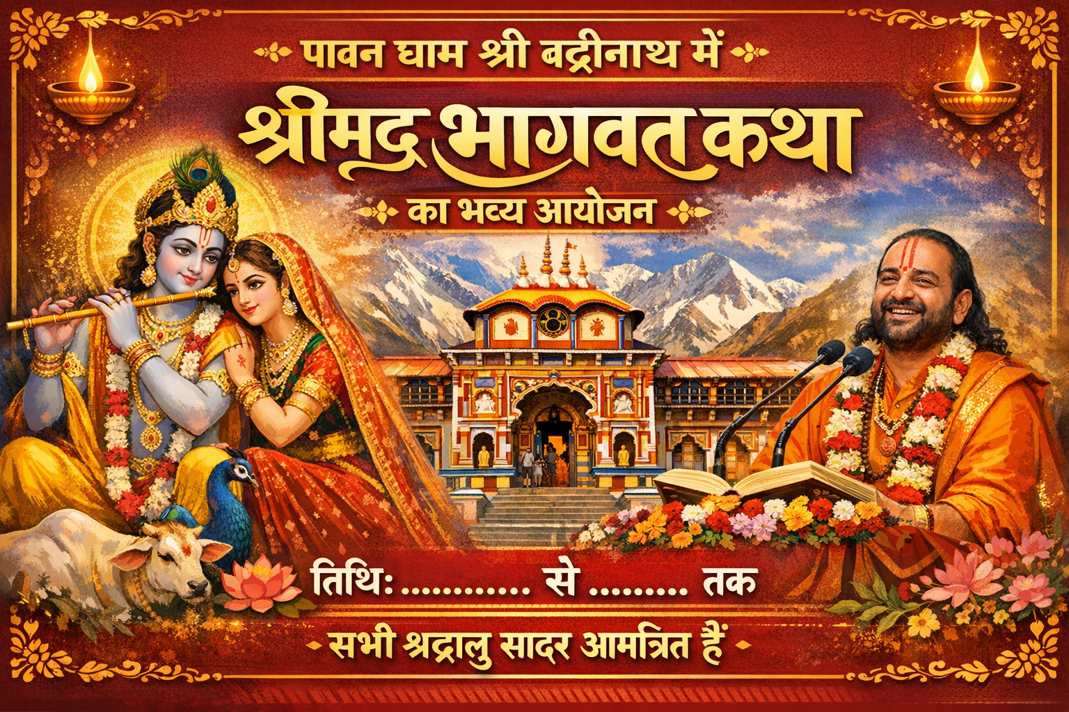 At the sacred land of Shri Badrinath Dham, we organize divine Shrimad Bhagwat Katha for devotees seeking spiritual peace and blessings of Lord Krishna. If you wish to arrange a Bhagwat Katha for your family, group, or on a special occasion, we provide complete end-to-end arrangements at the holy dham.